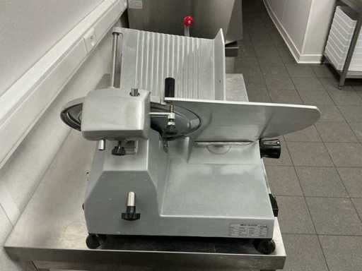 De vleessnijmachine bevindt zich in gebruikte maar werkende staat.