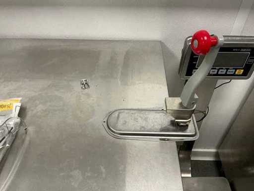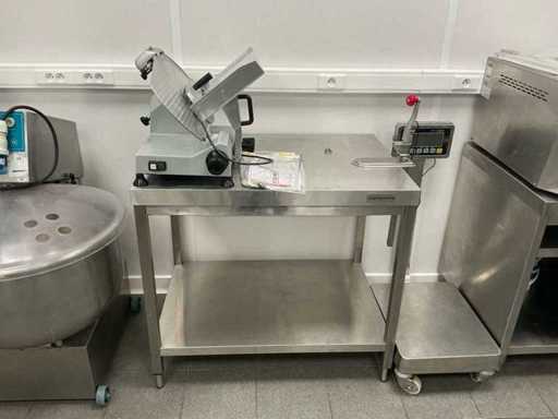Het lot bevat de vleessnijmachine, inox tafel en de press.