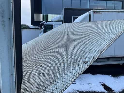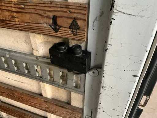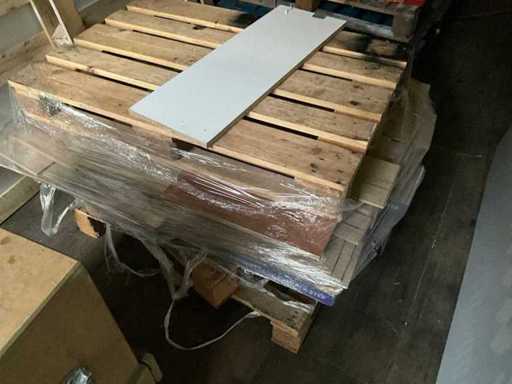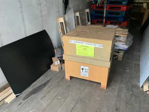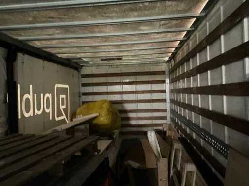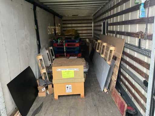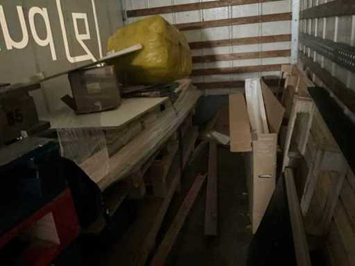 Compleet met inhoud waaronder diverse palletten, houtafval en snijafval laminaat
