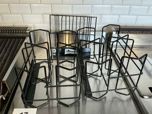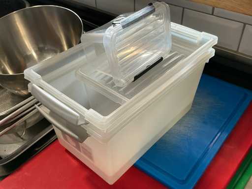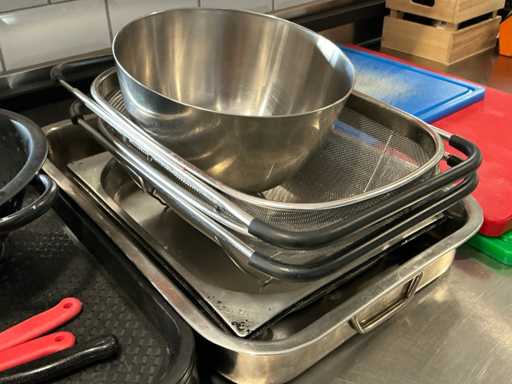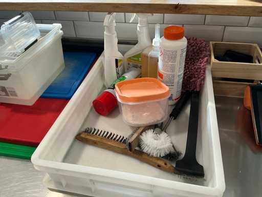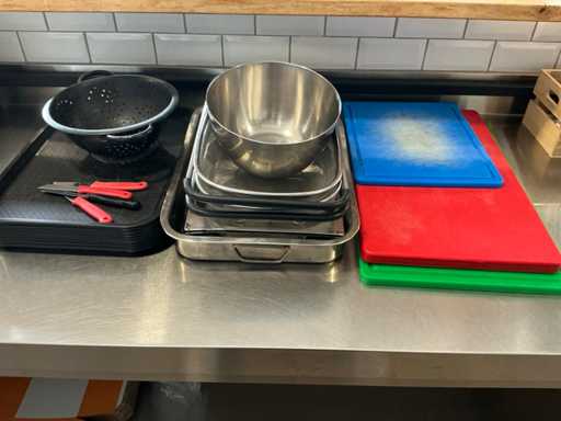 3 diverse kunststof snijplanken, 2 rechthoekige zeven voorzien van inox frame, 2 diverse inox schalen compleet met inox mengkom, 8 kunststof dienbladen, 3 diverse metalen sausfleshouders waaronder getekend VANDEMOORTELE, enige diverse onderhoudsproducten en 1 draagbare radio Pulsar,