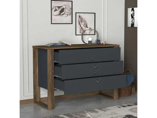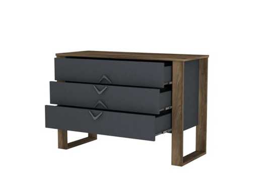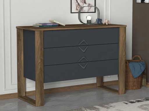 Moderne ladekast met drie lades, walnoot buitenafwerking en houtskoolkleurige lades