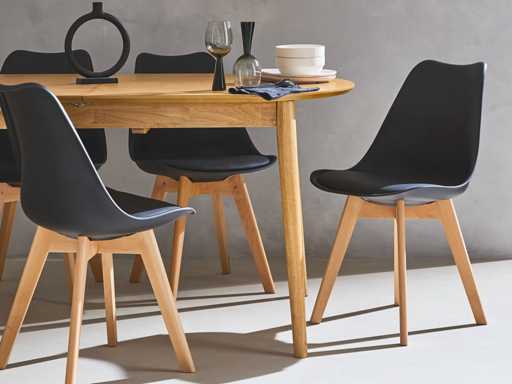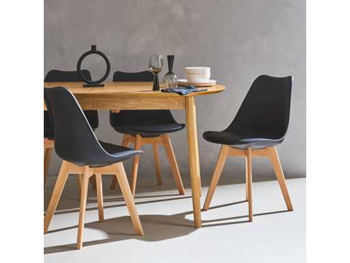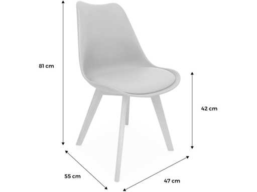 Zitmateriaal: polypropyleen Poten: Beukenhout Kussenvulling: 100% polyester en acrylstof (120gr/m²) Kussenvulling: schuim (1,8 cm dik) Stoelafmetingen: Voetengewicht: 4,3 kg (per stoel) Zitafmetingen: L47xD43cm Zithoogte: 42cm rugleuningafmetingen: W27xH39cm Kussenafmetingen: W45 x D38cm Maximaal ondersteund gewicht: 110kg