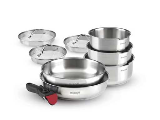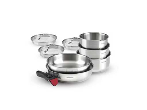 Brandt roestvrijstalen kookgerei set 18/8 - 9 stuks, afneembaar handvat, alle kookpitten inclusief inductie