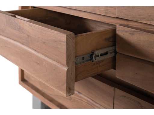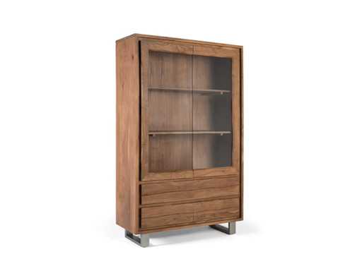 Een vitrinekas van massief acaciahout met een sobere en moderne stijl. Het is uitgerust met twee glazen deuren met frames, waardoor het interieur, dat bestaat uit twee ruime planken, kan worden tentoongesteld. Eronder zitten vier grote lades met gladde houten fronten en zonder zichtbare handgrepen. Hij staat op rechte metalen poten, wat hem een lichte en industriële uitstraling geeft, in contrast met de natuurlijke warmte van de acacia. Ideaal voor ruimtes die functionele opslag met een stijlvol ontwerp vereisen, zoals eetkamers, woonkamers of kantoren.