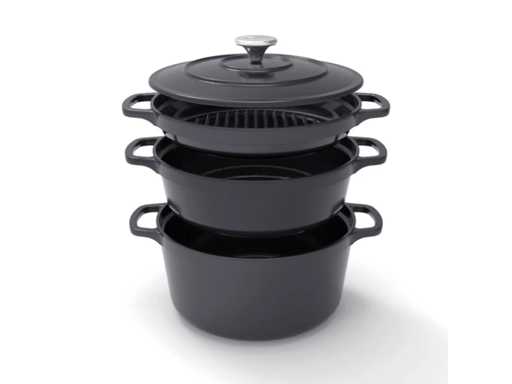 - Een 25 cm gietijzeren ovenschaal - Een 25 cm gietijzeren koekenpan - Een 25 cm gietijzeren grillpan - Een 25 cm gietijzeren deksel