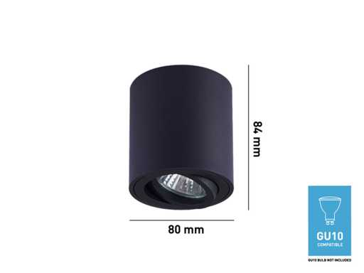 afdichting IP20, product kleur zand zwart, afm. Ø 80 x 84mm, bevestiging inclusief, materiaal aluminium, fitting GU10, bulb niet inbegrepen, geschikt voor binnen, een bulb invoer, voltage 220-240V, SKU 00835