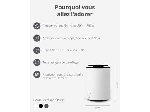 SNELLE VERWARMING - Met 1800W vermogen warmt onze keramische verwarming je in recordtijd op. In boostmodus kan hij een kamer van 30 m² twee keer zo snel verwarmen als een gewone elektrische kachel dankzij het efficiënte PTC-verwarmingselement.