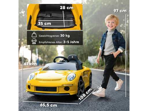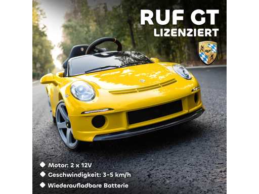 RUF GT elektrische auto voor kinderen met een rijbewijs. Deze RUF GT gelicentieerde elektrische kinderauto bootst het ontwerp van een indrukwekkende sportwagen na. Uitgerust met twee 12 V motoren bereikt hij een snelheid van 3 tot 5 km/u en stelt het kinderen in staat om veilig een high-performance voertuig volledig gecontroleerd te besturen. Dubbele besturing: Kinderen kunnen autonoom in het elektrische voertuig rijden en kiezen tussen twee versnellingen. Ouders kunnen ook ingrijpen dankzij de 2,4 GHz radiofrequentieafstandsbediening, die drie snelheidsniveaus en een bereik van 20 m biedt, voor verhoogde veiligheid. Rijd veilig en soepel: dankzij het soft start-systeem is plotselinge acceleratie geen probleem meer, en absorbeert de achterophanging van de elektrische kinderauto ongelijkheid in de weg. Op deze manier genieten kinderen van een aangename rit op alle soorten ondergronden en hebben ze een veilige rijervaring. Laat je plezier op hol gaan: Uitgerust met een accu-indicator zodat ouders het energieniveau kunnen monitoren en onderbrekingen kunnen voorkomen, biedt deze elektrische auto lichtbalken voor en achter, evenals een stuurwiel met claxon, muziek, muziek en een USB/MP3-poort voor urenlang rijplezier. Gebouwd voor avontuur: Gemaakt van duurzaam plastic en metaal, kan deze kinderauto tot 30 kg dragen. Hij is uitgerust met rubberbeklede wielen voor uitstekende grip en een veiligheidsgordel.