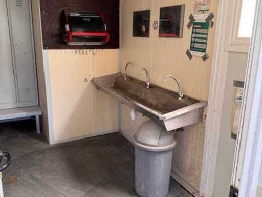Wasgoot in aluminium van ± 1,80 x 0,40 m, voorzien van 3 koud water dienstkranen, drie zeepschaalhouders, drie spiegels van ± 40 x 30 cm, en drie handdoekhaakjes.