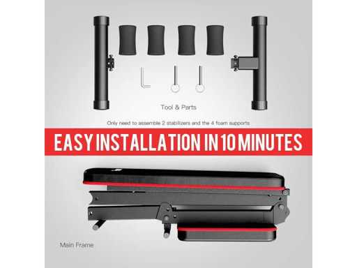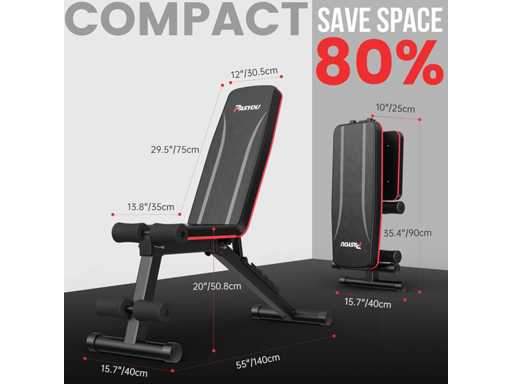 ? Bespaar je 80% ruimte? De Abs Bench is bijna volledig gemonteerd, het pakket bevat montage-instructies en gereedschap. Het enige wat je hoeft te doen is de voor- en achterste steunbuizen in elkaar zetten. Na je training kun je ze gewoon opvouwen en in de hoek, in de kast of onder het bed leggen. Gevouwen afmetingen: 90 x 40 x 25 cm. Bespaar 80% ruimte.