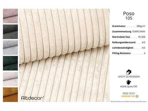 De beschrijving van de POSO-stof is een zacht aanvoelende, geribbelde pol (35.000 Martindale-cycli), een gemakkelijk schoonmaakbare, lichtbestendige (5) en pilbestendige (5) bekledingsstof met een gewicht van 380 g/m² ±5%.