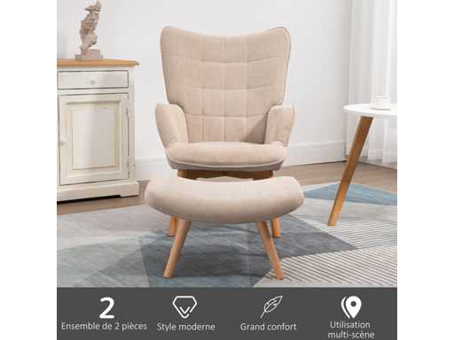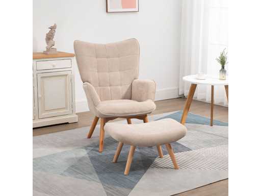 Fauteuil met voetensteun, hoge rugleuning, houten poten en stof die op een corduroy-look lijkt,