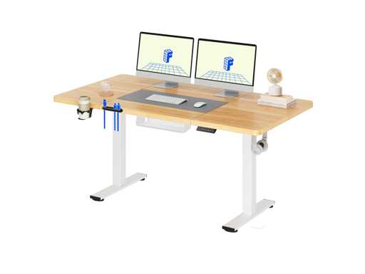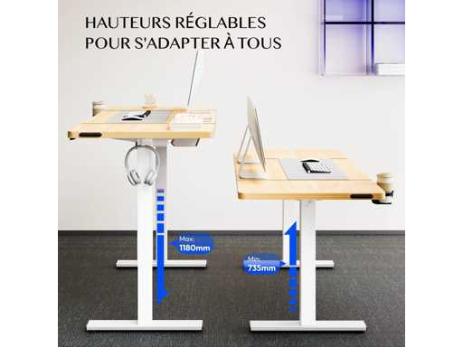 Onze voordelen: Oneindig verstelbare hoogte - Ideaal om van zittend naar staan te gaan Draagvermogen tot 70 kg - Stabiel stalen frame voor dagelijks laden Stille motorwerking - Minder dan 50 dB om ongestoord te werken Zijbekerhouder - Drankjes altijd bij de hand Handige haken - voor koptelefoons, tassen of rugzakken Geïntegreerd kabelbeheer - voor een opgeruimd werkstation Opbergruimte onder de tafel - Meer ruimte op het tafelblad Afgeronde hoeken - Meer veiligheid voor kinderen en huisdieren Groot hoogteverstelbereik Met een verstelhoogte van 73,5 tot 118 cm past de tafel zich flexibel aan – perfect voor kinderen die studeren of volwassenen die in een thuiskantoor werken, zittend of staand. Robuuste constructie Het stevige stalen frame ondersteunt tot 70 kg - genoeg voor meerdere schermen, boeken of technische apparatuur. Een solide metgezel voor productieve dagen, zonder enige wankelingen. Productdetails: Lengtebereik: 73,5 cm - 118 cm Maximale laadcapaciteit: 70 kg Ruisniveau: = 50 dB Randontwerp: Afgerond en kinderbestendig Kabelbeheer: Geïntegreerd met beugels en opslag Accessoires: Bekerhouder en helmhaak inbegrepen