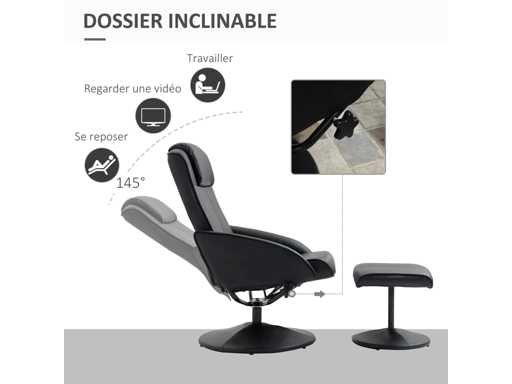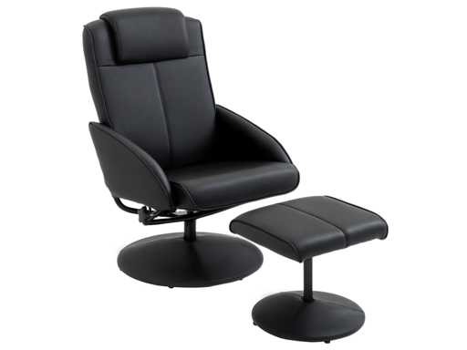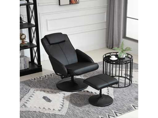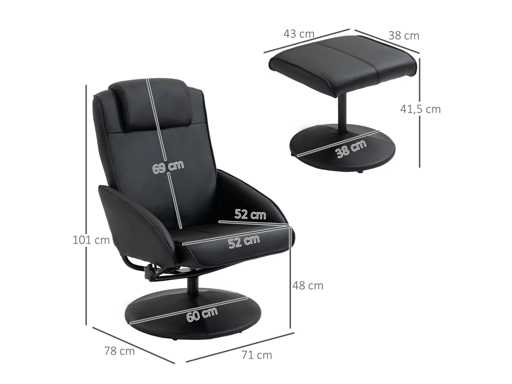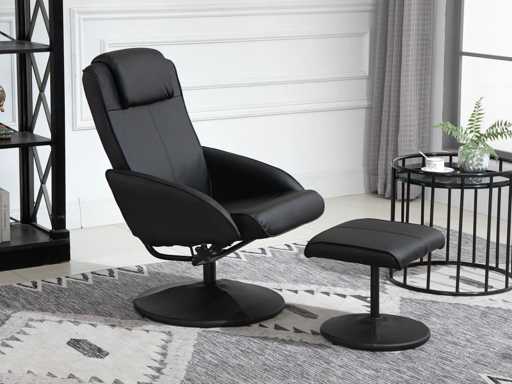 Specificaties: - Kleur: zwart - Materialen: synthetische coating, staal, cellulosevulling, schuimvulling - Sun. fauteuil: 71L x 78D x 101H cm cm - Sun. helling: 67B x 112D x 84H cm - Sun. voetensteun: 43L x 38B x 41,5H cm - Maximale helling: 145° - Sun. Rugleuning: 52B x 69H cm (dikte: 15 cm) - Sun. Zitting: 52L x 52B x 48H cm (dikte: 11 cm) - Armleuninghoogte: 57 cm - Ø fauteuilspoot: 60 cm - Ø voetensteun: 38 cm - Aanbevolen maximale belasting: 120 kg (fauteuil), 100 kg (voetsteun)