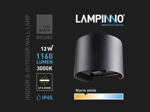 afdichting IP65, verstelbare hoek van de lichtbundels, lichtkleur 3000K warm wit, lichtstroom 1160 lumen, COB LED, materiaal aluminium, boven en onder verlichting, afm. Ø 140mm x 120mm x 100mm, voltage 220-240V, bevestiging inclusief, geschikt voor binnen en buiten, SKU 00978