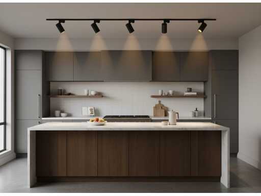 1 stuks 1 fase 2 draad 200cm rail, materiaal aluminium, bevestiging inclusief, 220-240V, afdichting IP20, product kleur zand zwart of zand zwart, 6 stuk railspots GU10 armatuur afm. Ø 55 x 100mm draaibaar 350° en kantelbaar 90°, bulb niet inbegrepen, de rail kan eenvoudig op de gewenste lengte worden gezaagd, geschikt voor binnen, HRZ300 SKU 907