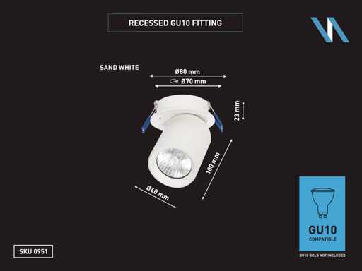 afdichting IP20, product kleur zand wit, afm. Ø 60 x 100mm, inbouwdiameter ø 70mm, draaibaar 350° en kantelbaar 50°, materiaal aluminum, bevestiging inclusief, fitting GU10, bulb niet inbegrepen, geschikt voor binnen, een bulb invoer, voltage 220-240V, max 40 watt, SKU 00951