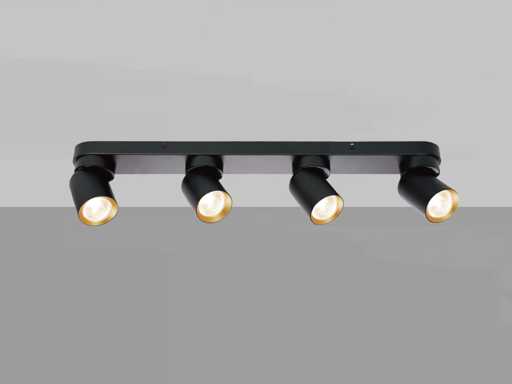 afdichting IP20, product kleur zand zwart en goud ring, afm. Ø 60 x 100mm, afm wandhouder 600 x 60 x 25mm, draaibaar 350° en kantelbaar 50°, materiaal aluminum en ijzer, bevestiging inclusief, fitting GU10, bulb niet inbegrepen, geschikt voor binnen, 4 x bulb invoer, voltage 220-240V, max 40 watt, SKU 00966