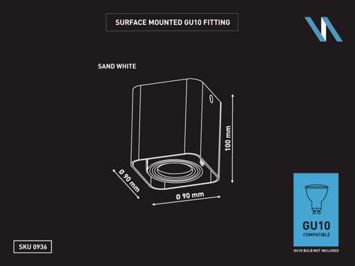 afdichting IP20, product kleur zand wit, afm. 90 x 90 x 100mm, bevestiging inclusief, materiaal aluminium, fitting GU10, bulb niet inbegrepen, geschikt voor binnen, een bulb invoer, voltage 220-240V, SKU 00936