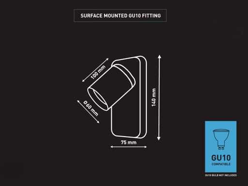 met aan/uit knop, afdichting IP20, product kleur zand wit, afm. Ø 60 x 100mm cilinder kop 75 x 140mm wandhouder, draaibaar 350° en kantelbaar 50°, materiaal aluminum, bevestiging inclusief, fitting GU10, bulb niet inbegrepen, geschikt voor binnen, een bulb invoer, voltage 220-240V, max 20 watt, SKU 00943