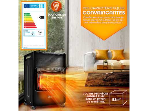 KRACHTIG EN ENERGIEZUINIG: Deze gaskachel biedt drie verwarmingsniveaus (1500 W, 2800 W, 4200 W) om u snel en efficiënt aangename warmte te geven. Dankzij het lage verbruik (energie-efficiëntieklasse: A) is de katalytische verwarming niet alleen krachtig, maar ook zeer economisch in gebruik. Dit betekent dat je goedkoop kunt verwarmen zonder in te leveren op prestaties.