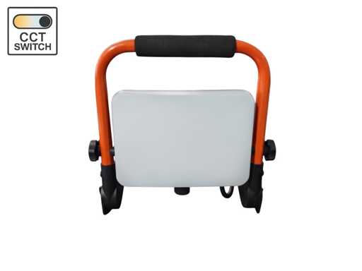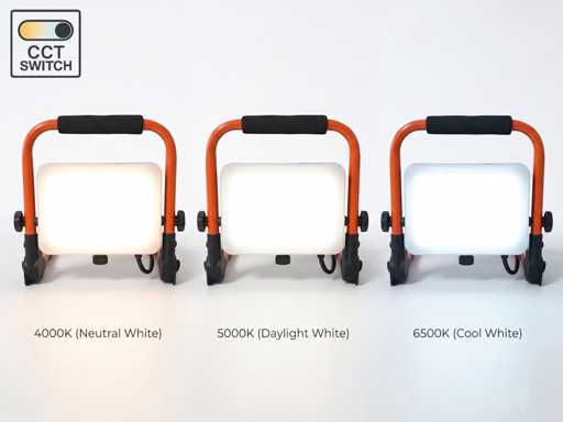 lichtkleur 3 in 1 CCT switch neutraal wit en daglicht dat de kleurtemperatuur kan geschakeld worden tussen 4000K 5000K 6000K, waterdicht IP65, lichtstroom max 4200 lumen, product kleur wit orange zwart, afm 218 x 235 x 80mm, stralingshoek 110°, poten inklapbaar, behuizing staal aluminium en PC, bevestiging niet inclusief, 220-240V, 150cm rubber kabel, sku 1186