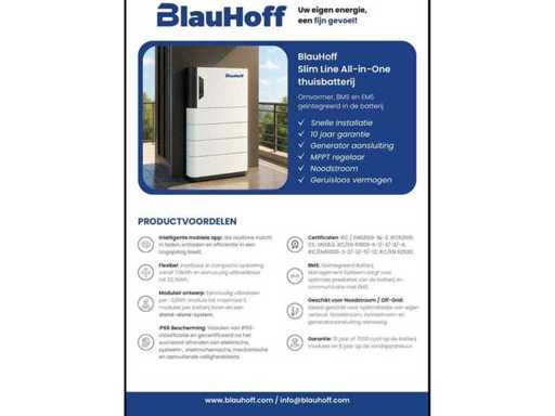 Voorzien van: 11,4 kW, All in one met 12 kW omvormer, MPTT, mogelijkheid tot noodstroom, generatoraansluiting, EMS EN BMS geïntegreerd in omvormer, IP66, inclusief app, certificaten compleet.