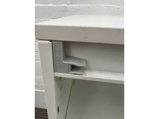 afmetingen H118 x B180 x D50, 3 legplanken per zijde, kleur frame wit, metaal, kleur topblad wit melamine, sleutel niet gegarandeerd.