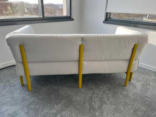 Tweezitsbank met poten van gegoten aluminium en een stalen frame met elastische banden. Zitkussen, rugleuning en armen van polyurethaan met afneembare hoes van stof.