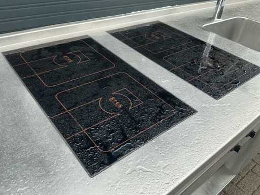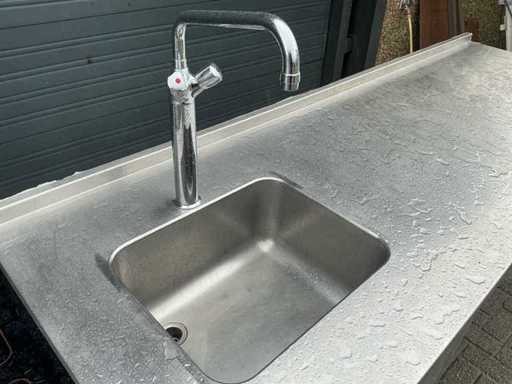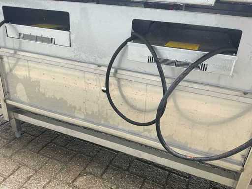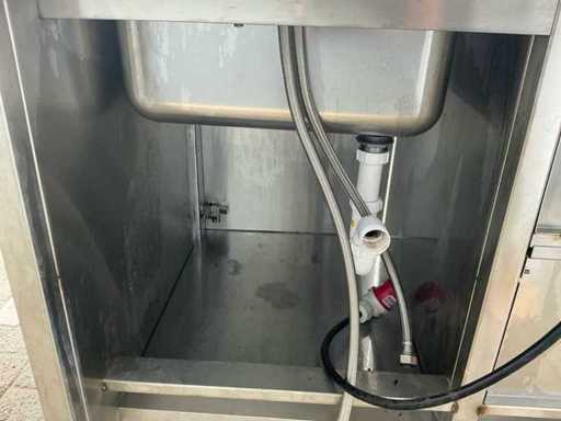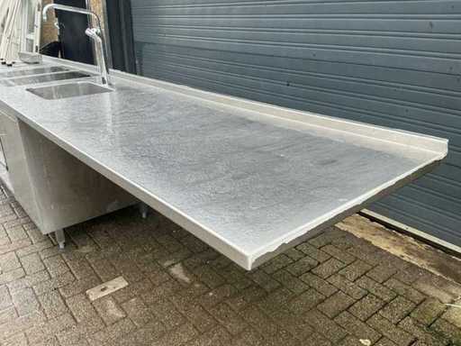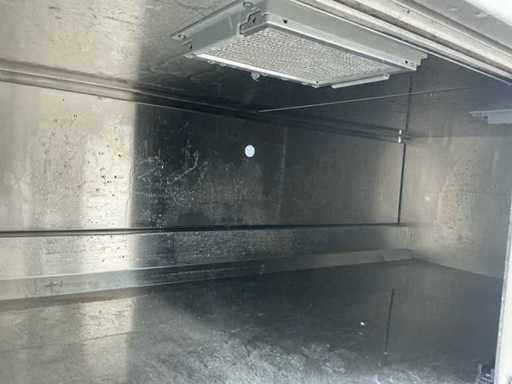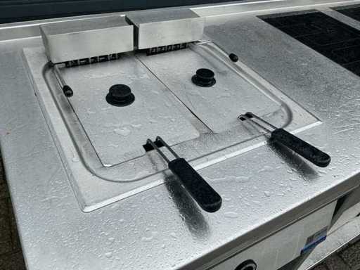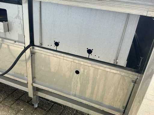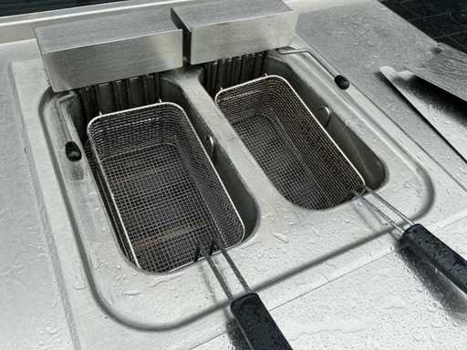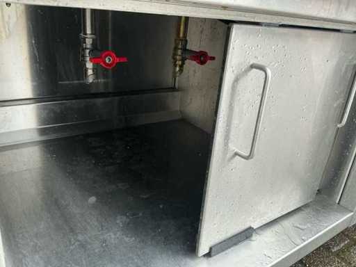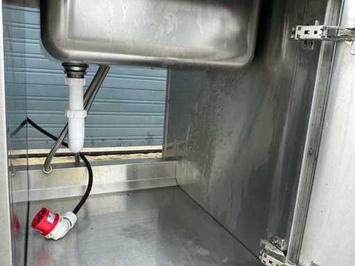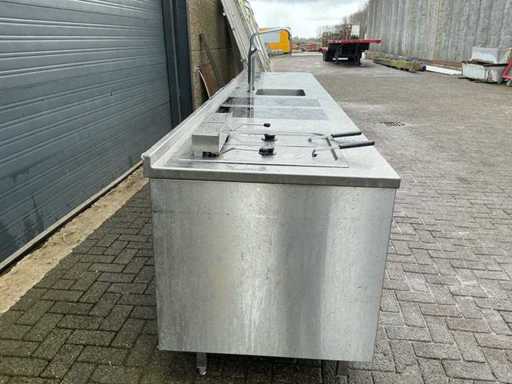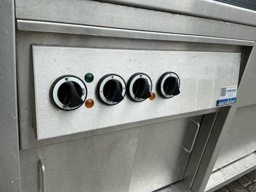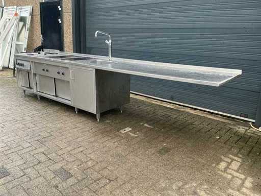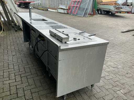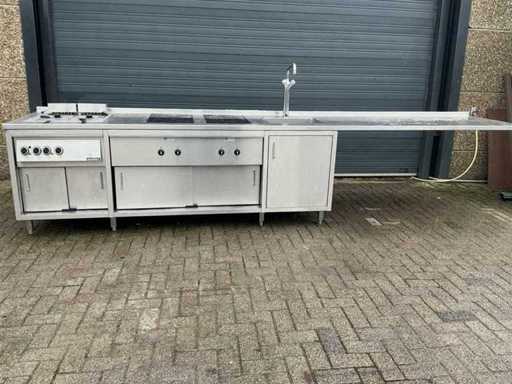Voorzien van: Ascobloc kookeiland 433x85x75 met electrisch 4 pits fornuis, 2x friteuse, opbergruimte, wasbak met kraan