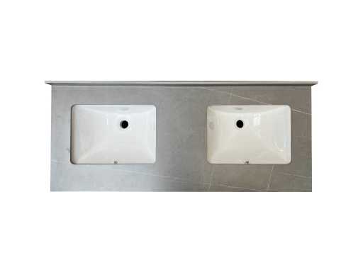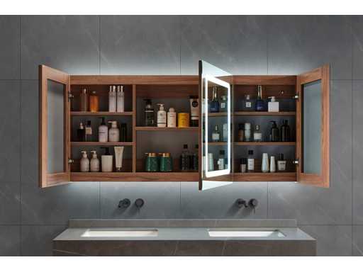 onderkast bxdxh 150x48x50cm - spiegelkast bxdxh 150x10x70cm - wastafel bxdxh 150x50x10cm, Kleur bruin walnoot, Materiaal 2cm 5-laags multiplex(zeer sterk en vochtbestendig) met melamine toplaag, Kranen exclusief , Lades 4 stuks met softclose, Wastafel bestaat uit sintered stone vlakke delen met 2 witte keramische bakken daar onder (wasbak wordt standaard zonder kraangaten geleverd maar kunt u naderhand eventueel wel er in boren zodat u kranen uit het blad kunt gebruiken als dit uw voorkeur geeft), Spiegelkast met ledverlichting en verwarming(anti condens), compleet met installatiemateriaal, Afvoeren en kranen exclusief, Conditie: Nieuw in doos, Bijzonderheden; 2 jaar garantie