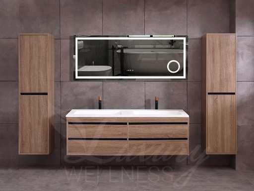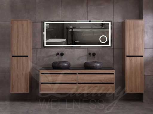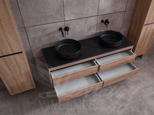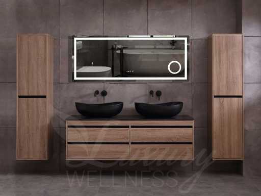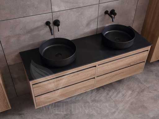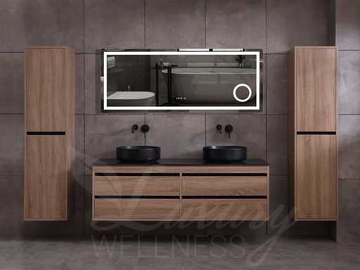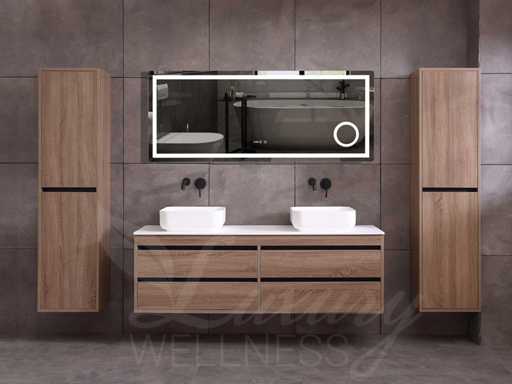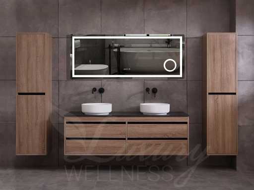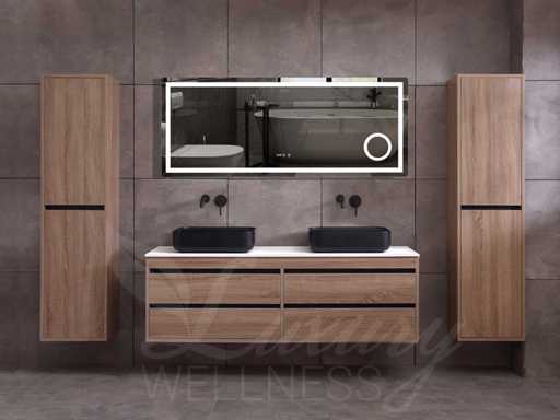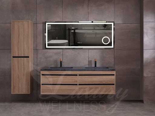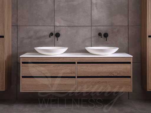 badkamermeubel 2-persoons 160cm (bruin eiken) met (hangkast) en natuursteen of solid surface wastafel(s)
