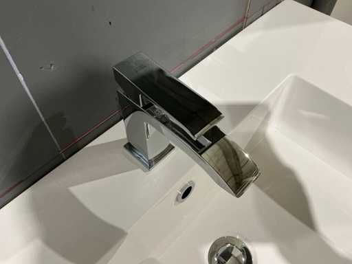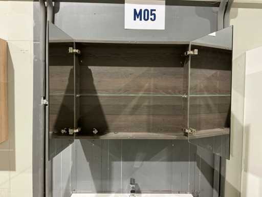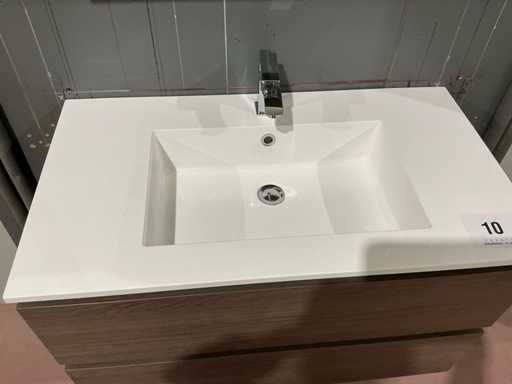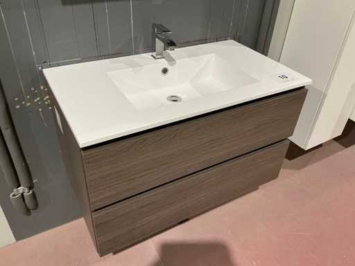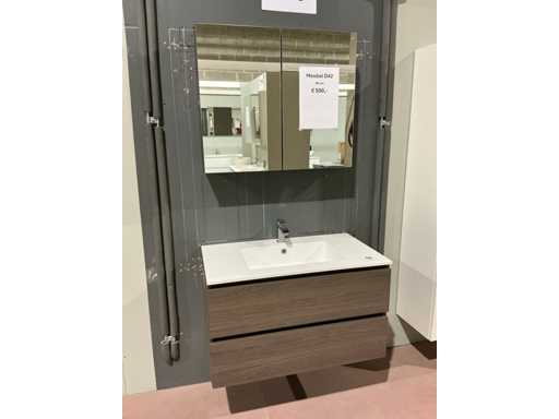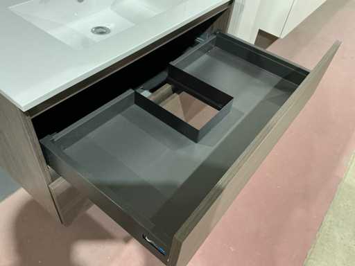 Voorzien van 2x schuiflade en enkele wastafel. Compleet met kraanwerk Paffoni en spiegelkast voorzien van 2x deur met afmetingen ca. 90 x 68 x 17cm voorzien van 2x kastdeur. Door koper te demonteren van omgeving.