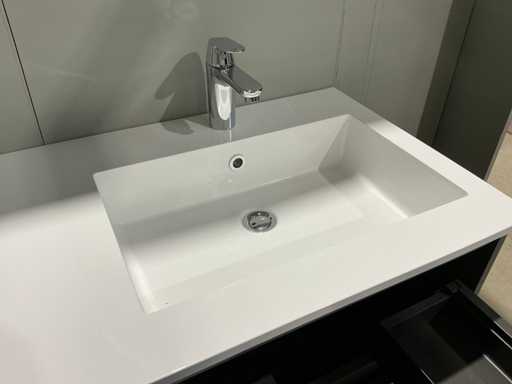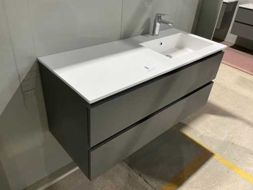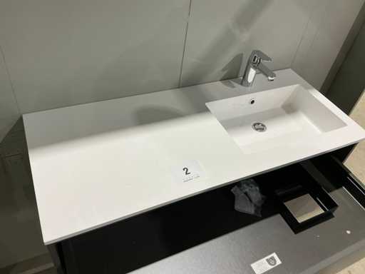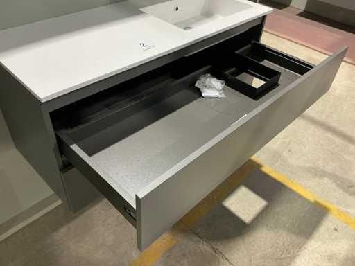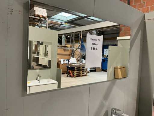 Voorzien van 2x schuiflade en enkele wastafel. Compleet met kraanwerk en spiegel met afmetingen ca. 120 x 60cm.