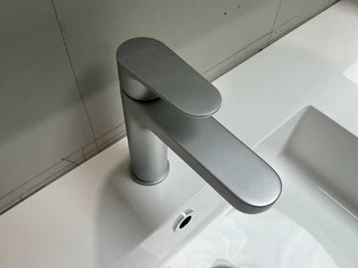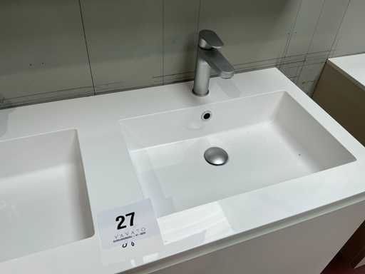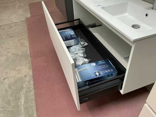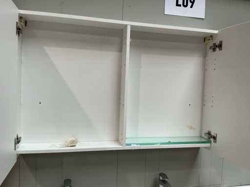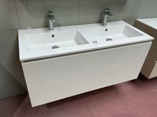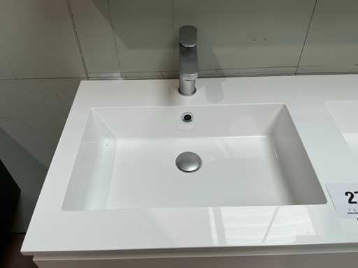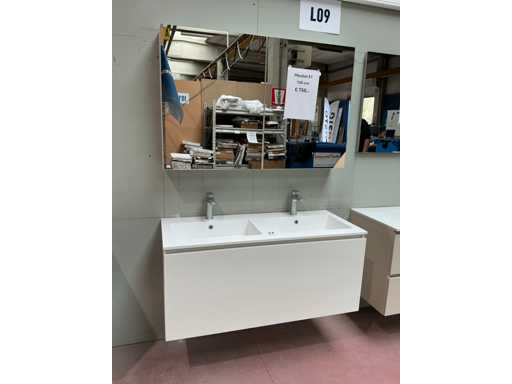 Voorzien van 1x schuiflade en dubbele wastafel. Compleet met kraanwerk Ideal Standard en spiegelkast voorzien van 2x kastdeur met afmetingen ca. 120 x 77x 17cm. Door koper te demonteren van omgeving.