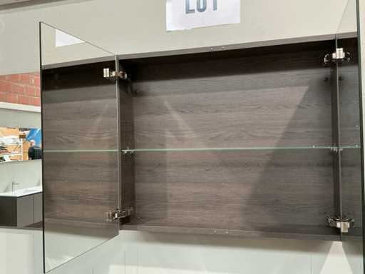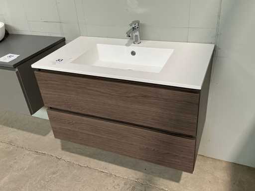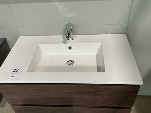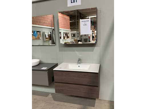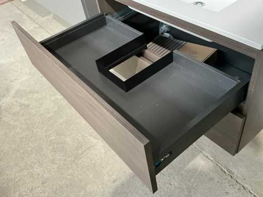 Voorzien van 2x schuiflade en enkele wastafel. Compleet met kraanwerk Ideal Standard en spiegelkast voorzien van 2x kastdeur met afmetingen ca. 90 x 68 x 18cm. Door koper te demonteren van omgeving.
