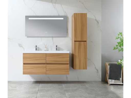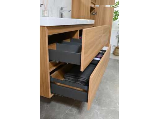 Type: 9015H. Afmeting: 3-delige set: 1 * Wastafelmeubel - 1200x450x600mm, 1 * Zijkast - 1500x350x350mm, 1 * Spiegel- 1200x600mm. Voorzien van: Kranen inclusief pop-up afvoer – 4 stevige metalen lades - Softclose lade systeem - LED spiegel met anti-fog systeem - Voorgemonteerde zijkast en wastafelmeubel.