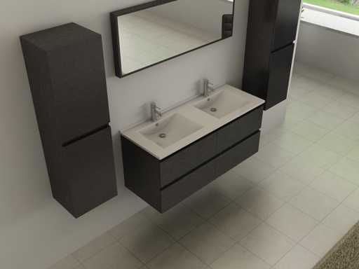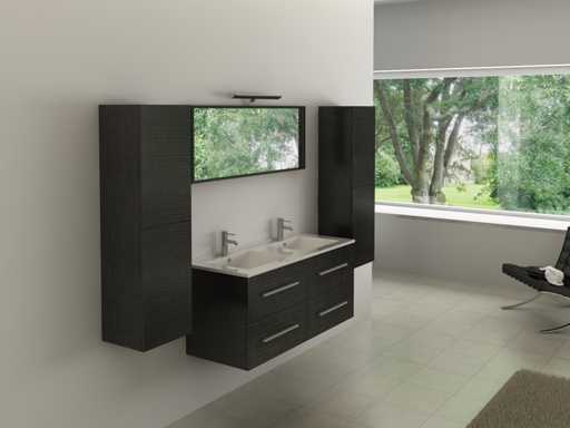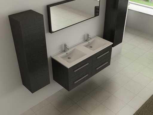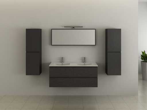 Type: BL5185. Model: 2-persoons badkamermeubel 120cm zwart hout decor. Kranen: Inclusief. Afmeting: 2-persoons set: 1 * Wastafelmeubel - 1200x455x520mm, 2 * Zijkasten - 1500x350x350mm, 1 * Spiegel - 1200x450x60mm. Voorzien van: Kranen inclusief pop-up drain - Softclose lade systeem - Spiegel met lichtspot - Voorgemonteerde zijkasten en wastafelmeubel.