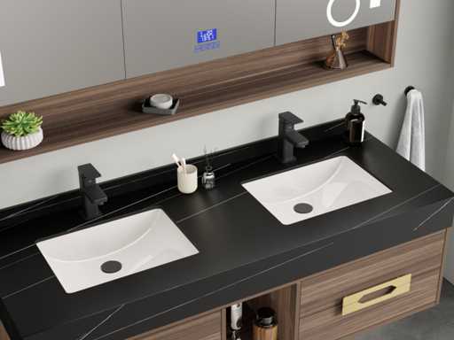 Type: MBY-315-WM. Afmeting: 2-persoons set: 1 * Wastafelmeubel - 1500x550x430mm, 1 * Spiegelkast - ca. 1500x160x700mm. Voorzien van: Softclose lade systeem: 4 stevige metalen lades - Zwarte kranen inclusief pop-up drains (chrome) - Goudkleurige metalen handgrepen - Spiegel met: touchscreen LED-verlichting in 3 kleuren, dimbaar, digitale klok + thermometer, Bluetooth + speakers, anti-fog technologie, kopervrij - Voorgemonteerd wastafelmeubel.