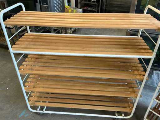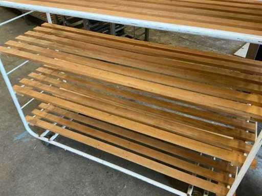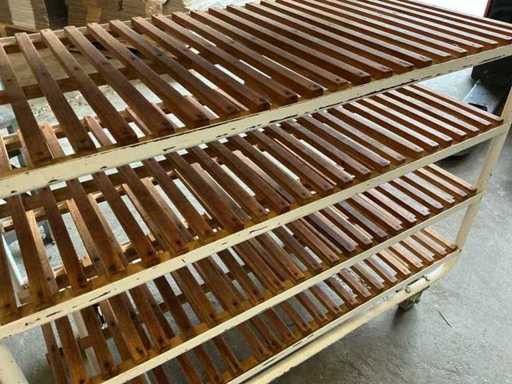 1 rek 155cm breed, 55 cm diep en 160cm hoog. Voorzien van 5 lagen (hout) en wielen.