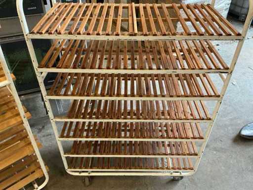 1 rek 110cm breed, 53 cm diep en 160cm hoog. Voorzien van 7 lagen (hout) en wielen.