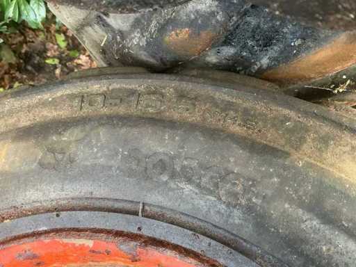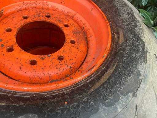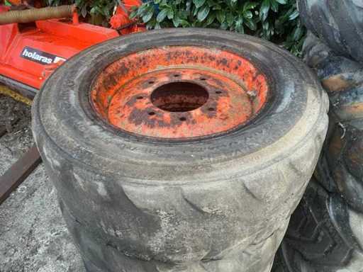 Bestaande uit Bobcat set Heavy wall 10-16.5 op 8 gaats velg. Graafmachine banden set BKT 400/60-15.5 op 8-gaats velg