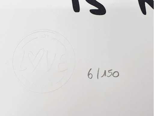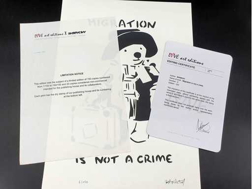 Gebaseerd op het werk "Migration is not a crime" in 2021 in Londen Banksy (na) Offsetdruk op getextureerd kunstpapier 300 gr/m² Gesigneerd in het plaatje rechtsonder Genummerd van de 150 exemplaren linksonder met droge stempel van de uitgever Met oplagecertificaat en drukproef van de uitgever Afmetingen: 29 x 42cm In perfecte staat Herkomst: Privécollectie (Londen) Het gepresenteerde aantal kan afwijken van de verzonden kopie