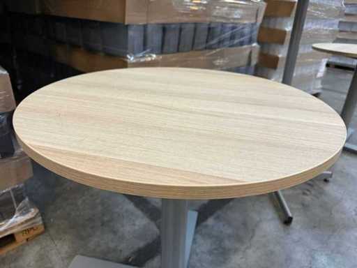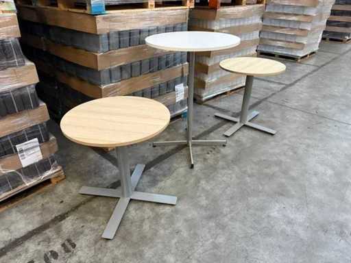 Set van 3 ronde bartafels, 2 waarvan met houten top en diameter 70 (hoogte 74) en een enkele witte top met diameter 80 (hoogte 110). In goede staat, kan variëren per item.