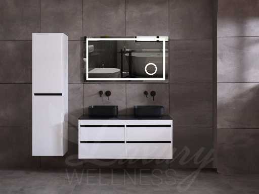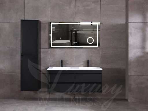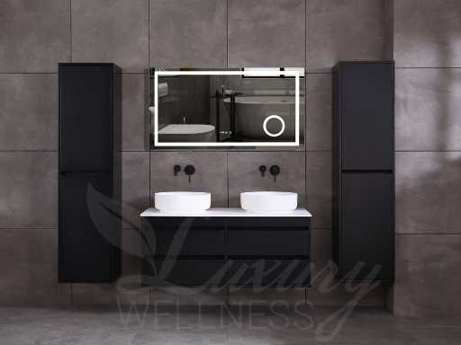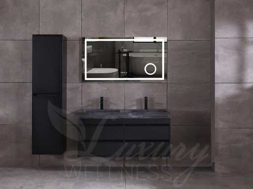 Afmeting meubel: bxdxh 120x49x50cm - hangkast 40x35x160cm, Kleur mat zwart of mat wit (keuze kleur graag doorgeven op info@mawialux.nl), Materiaal 2cm 5-laags multiplex(zeer sterk en vochtbestendig), Hangkast softclose deuren en extra planchets (hangkast is universeel en kan zowel links als rechts naast het meubel gehangen worden), Kranen exclusief , Lades 4 stuks met softclose, Wastafel natuursteen of solid surface (keuze uit diverse modellen van de laatste foto's vaste of losse wasbakken met een mat witte of mat zwarte solid surface top, vaste bakken zijn ook zonder kraangaten beschikbaar zodat u muurkranen kunt gebruiken! Spiegel ledspiegel met ledverlichting(6000K led-dioden)/vergrootglas/verwarming(anti condens)/klok met touchscreen, Afvoeren exclusief , Conditie: Nieuw in doos, Bijzonderheden 2 jaar garantie, compleet met installatiekit, mat zwarte aluminium grepen achter de inkepingen van de lades en deuren, natuursteen wastafel is behandeld met coating, zeer hoge kwaliteit