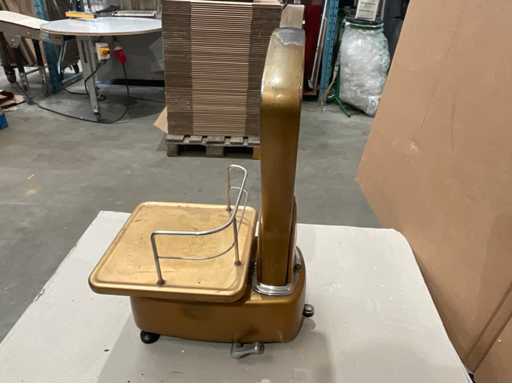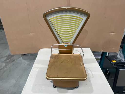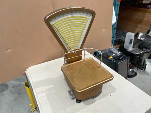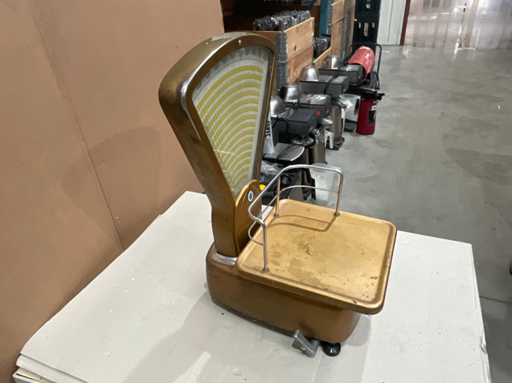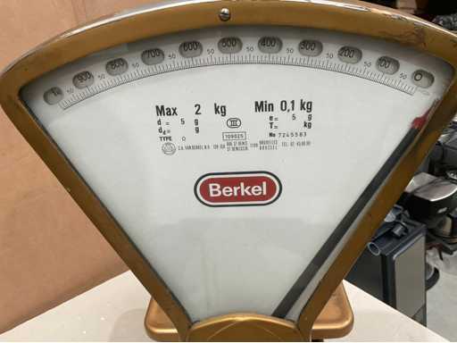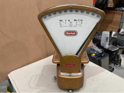 Berkel professionele mechanische schaal, Type O model, met dubbele leeswijzerplaat. Maximale capaciteit 2 kg, graduatie 5 g. Metalen constructie, rechthoekige bovenkant met steunstang. Het apparaat is in originele staat en vertoont tekenen van slijtage en lak. Operatie niet getest.