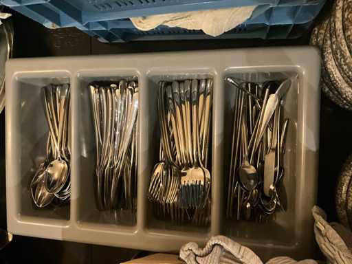 Inhoudende divers inox bestek waaronder KAROX, waaronder messen, vorken, soeplepels koffielepels, inox eetstokjes, botermesjes en koffielepels