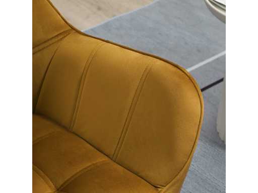 Specificaties: - Kleur: Geel - Materiaal: fluweel (100% polyester), rubberhout, metaal, schuim - Totale afmetingen: 67L x 61,5B x 71H cm - Zitoppervlak: 44L x 45B cm - Zithoogte: 37 cm - Kussendikte: 9 cm - Armleuninghoogte: 18,5 cm - Laadvermogen: 120 kg