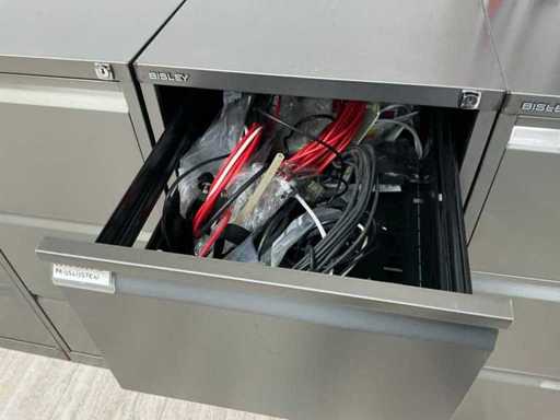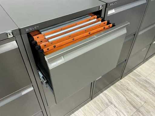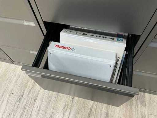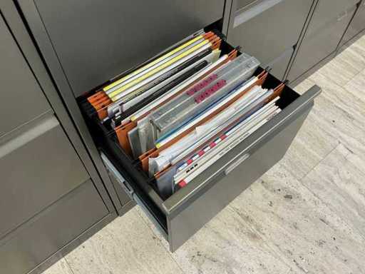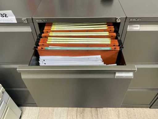 Voorzien van 3 lades waarvan meesten met hangmapstructuur, compleet met pvc mappenhouders voorzien van 22 vakken, zonder inhoud (boekhouding)