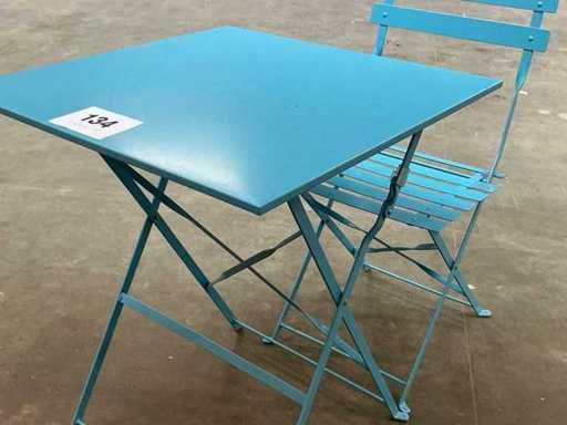 Bestaande uit 1 opklapbare tafel 60 x 60 x 72cm en 2 opklapbare bijzetstoelen
